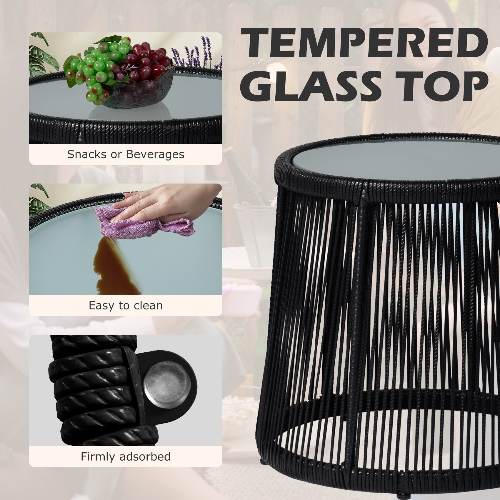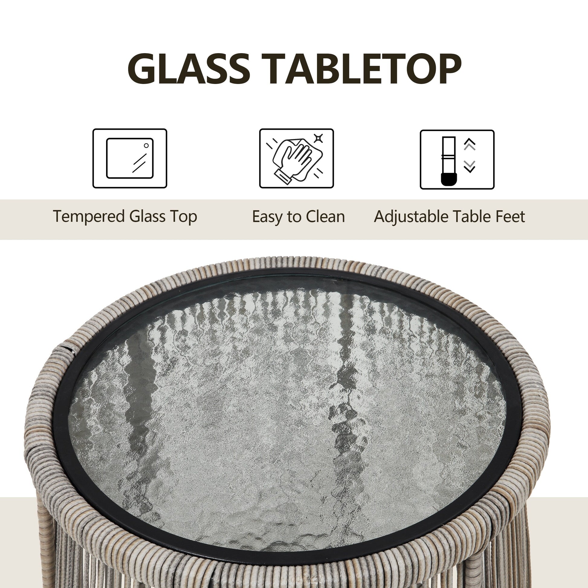 Notre ensemble de meubles en osier d'extérieur, fabriqué avec du rotin PE de haute qualité et une structure en acier solide, est durable et a une longue durée de vie, vous permettant d'en profiter pendant des années. Cet ensemble de bistro d'extérieur comprend une élégante table d'appoint en verre, parfaite pour quelques verres de vin ou le café et le journal du matin. Sa résistance aux intempéries facilite le nettoyage. La table basse en verre trempé se nettoie en une minute. Conçues ergonomiquement pour un confort optimal, les chaises de porche élégantes sont dotées de coussins épais et de pieds réglables pour une utilisation intérieure et extérieure. Cet ensemble de meubles de patio d'extérieur convient pour les bords de piscine, les pelouses, les jardins, les patios, les arrière-cours, etc. Il vous offrira une expérience plus confortable pour vous détendre pendant votre temps libre.