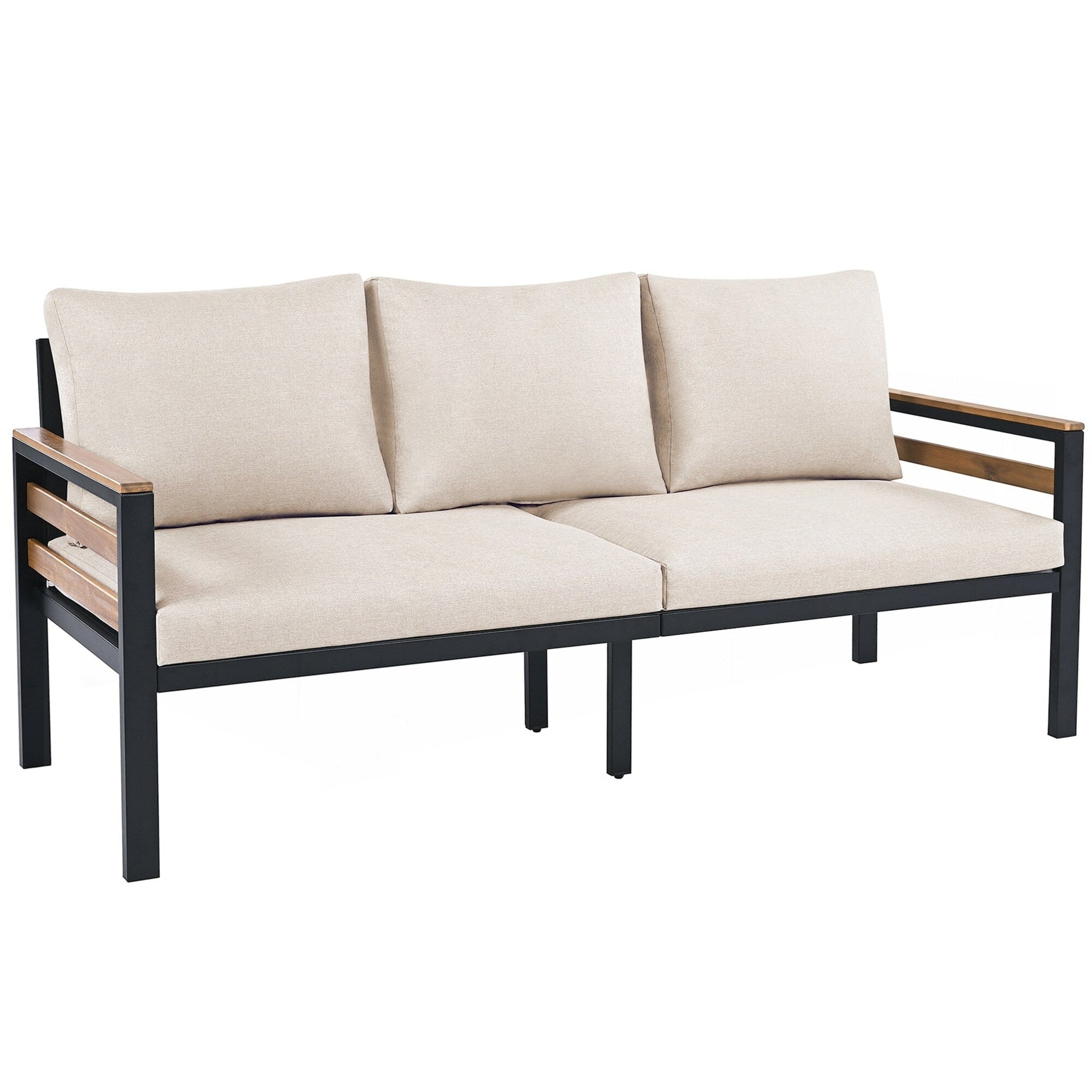 L'ensemble complet comprend : 1 canapé trois places (53,96 lbs), 2 fauteuils (26,43 lbs chacun), 1 table en bois d'acacia (18,28 lbs).