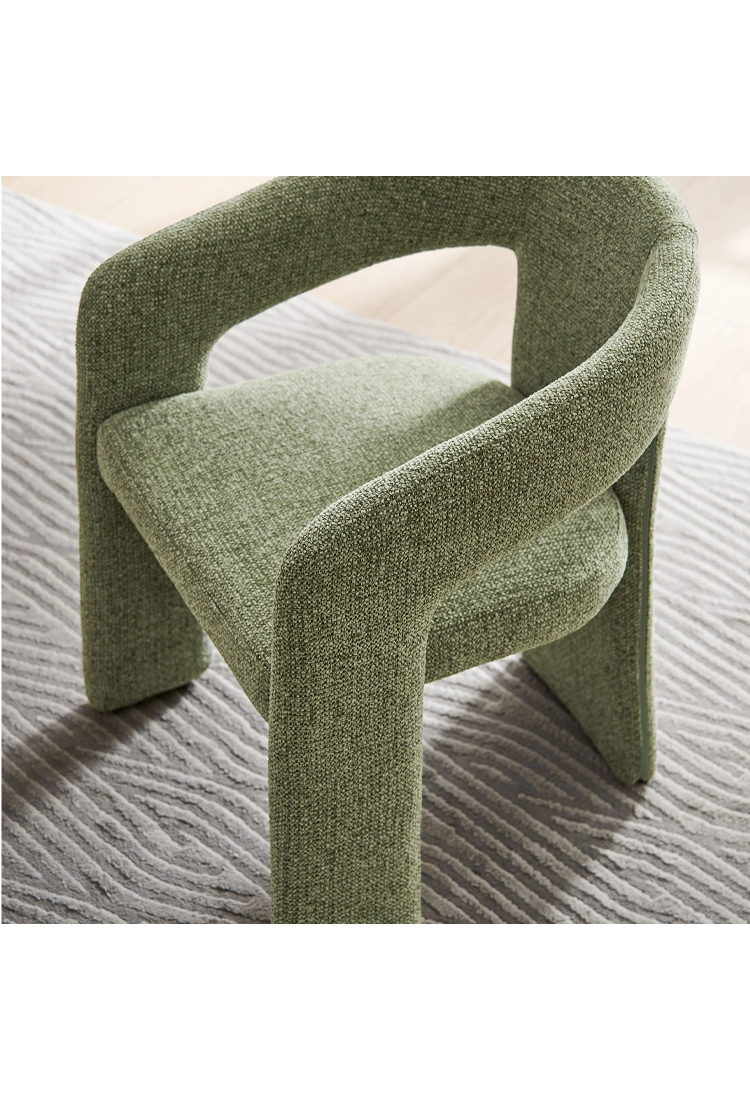 Ajoutez une touche de modernité et de fonctionnalité à votre salle à manger ou à votre salon avec la chaise de salle à manger en tissu Elyssia. Son cadre unique à trois pieds et son design saisissant lui confèrent une allure audacieuse, tandis que son tissu doux et texturé et son rembourrage ergonomique offrent un confort optimal pour les longs repas ou la détente. Certifiée durable, cette chaise est à la fois élégante et respectueuse de l'environnement.