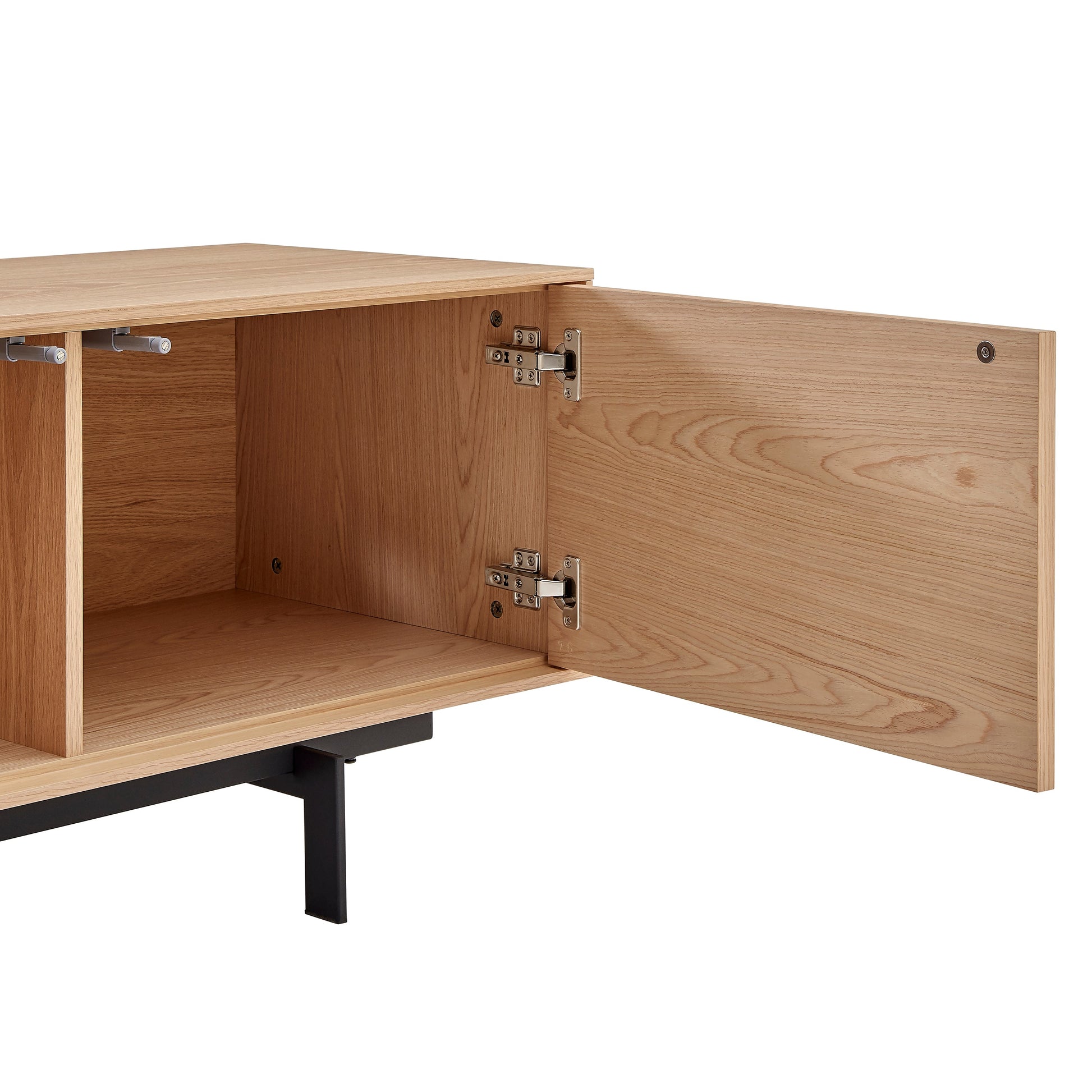 Ce meuble multimédia de 71 pouces est doté de 2 portes et de 2 tiroirs, offrant un espace de rangement infini. Son cadre extérieur est en placage de chêne naturel sur bois d'ingénierie et ses pieds en métal thermolaqué noir.