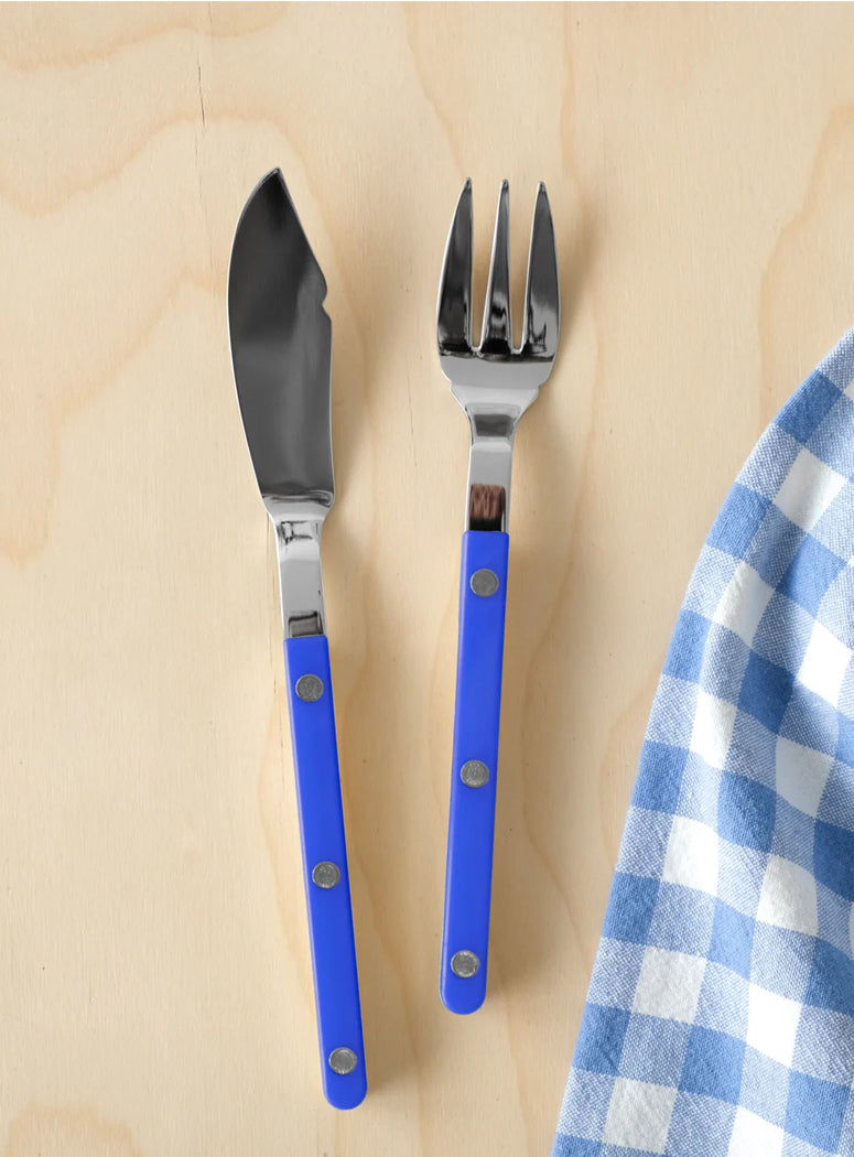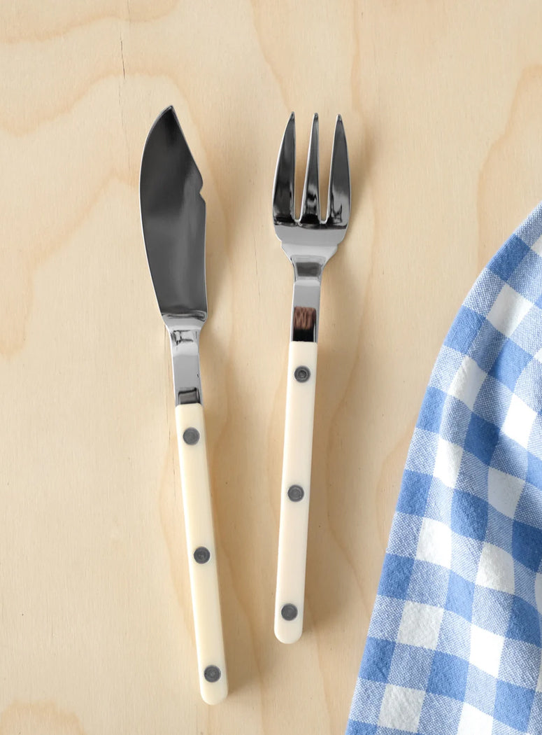 Inspirée des cafés et bistrots classiques, la collection Bistrot allie charme intemporel et modernité. Avec ses rivets apparents et ses couleurs éclatantes – des rouges audacieux aux effets corne et écaille – chaque pièce est conçue pour sublimer vos repas quotidiens. Disponible en finition brillante ou vintage. Cet élégant ensemble fourchette et couteau à poisson est parfait pour savourer les mets les plus délicats.
