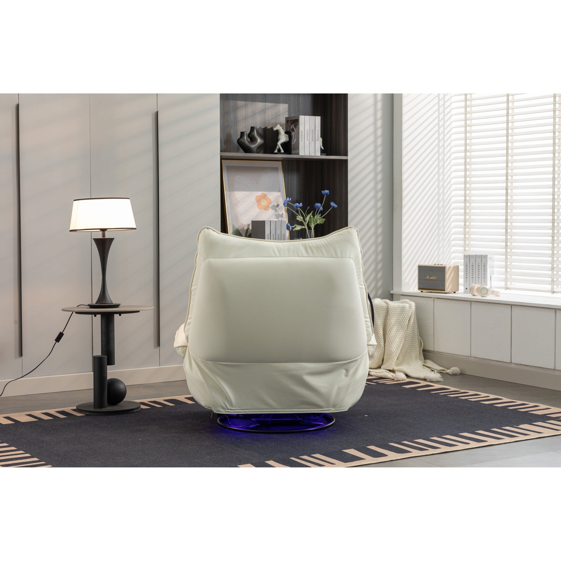 - Ce fauteuil inclinable pivotant à 270° allie confort et divertissement grâce à son porte-téléphone et ses ports de charge intégrés. Équipé de haut-parleurs Bluetooth pour un son immersif, vous pourrez facilement profiter de vidéos ou de musique tout en vous relaxant. Le fauteuil offre également un rangement caché dans les accoudoirs pour les petits objets, et son assemblage facile ne prend que 3 minutes, ce qui en fait un excellent ajout à n'importe quel salon, chambre à coucher ou appartement.