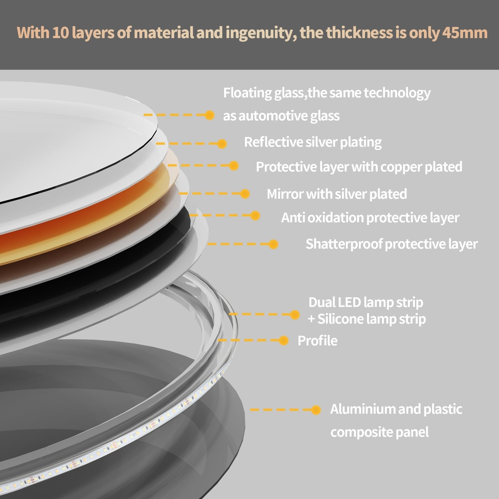 Un miroir élégant illumine la vie. Ce miroir de salle de bain sans cadre, orné d'un bord givré créatif, allie sophistication et luxe, créant un aspect harmonieux qui s'adapte à toutes les salles de bain. La bande LED diffuse une lumière plus uniforme. Il suffit d'appuyer brièvement sur le bouton pour changer la température de couleur : l'éclairage blanc offre un éclairage suffisant tandis que la lumière chaude crée une ambiance chaleureuse la nuit. La grande surface anti-buée intégrée permet de dégivrer le miroir en 3 à 4 minutes sous la douche, le gardant ainsi exempt de vapeur. Trois boutons sur l'écran permettent de contrôler indépendamment l'allumage/l'extinction, la luminosité, les couleurs d'éclairage et le dégivrage. Doté d'une prise standard, il peut être branché et déplacé dans n'importe quelle pièce disposant d'une prise de courant, sans nécessiter de câblage. Idéal pour les maisons, les bureaux et les projets hôteliers.