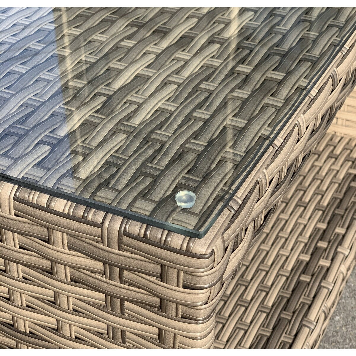 - Comprend 2 chaises sans accoudoirs, 4 chaises avec un seul accoudoir, 2 fauteuils, 2 poufs, 1 table d'appoint et 1 table avec plateau en verre trempé.