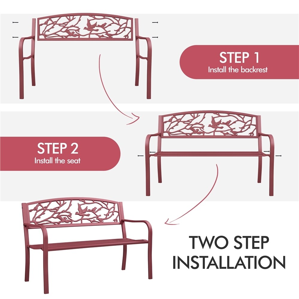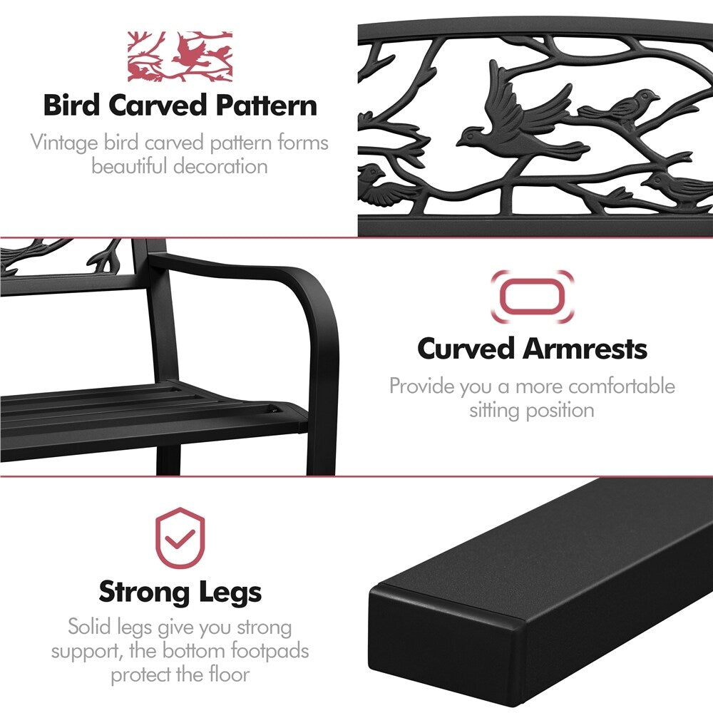 Apportez une touche de nature à votre espace de vie extérieur avec notre banc de jardin de patio Yaheetech 50'. Le motif vintage d'oiseaux sur le dossier ajoute de la beauté et permet une circulation d'air, tandis que l'assise légèrement incurvée est large et profonde pour un confort optimal. Fabriqué en fer robuste avec un revêtement protecteur imperméable, ce banc est conçu pour une utilisation intensive et suffisamment durable pour une utilisation à long terme. Avec une charge maximale de 180 kg/397 lb, il convient aux parcs, aux arrière-cours, aux jardins, aux mariages et plus encore. Les accoudoirs sont incurvés pour plus de confort, et l'assise est conçue avec des rayures verticales pour une meilleure circulation et une meilleure répartition du poids. La finition toutes saisons garantit une durabilité dans toutes les conditions météorologiques, et le montage est facile grâce aux outils et instructions inclus.
